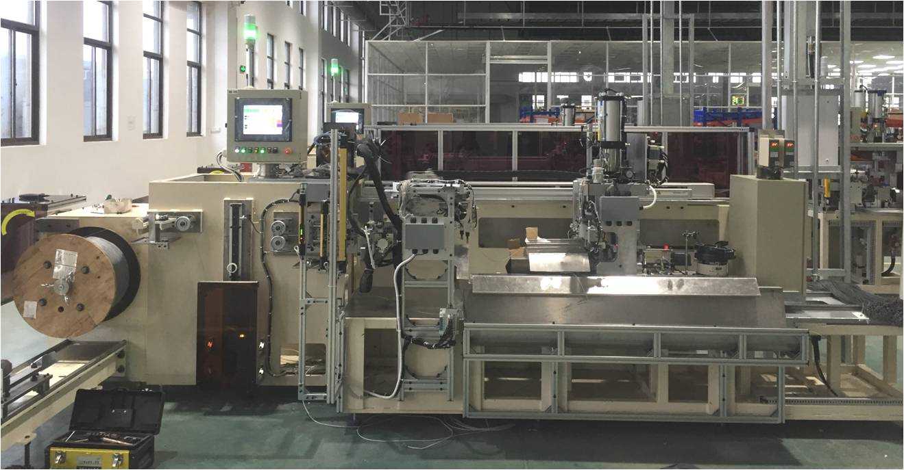 自動車用パワーウィンドウ動力用ワイヤー製造のための設備となります。 大きなボビンにてセットされる細いワイヤーを切断し、ストッパーとなる金具をカシメる動作を行い、 切断されたワイヤーの長さはマニピュレータにより非常に高精度に揃っております。 一般的にワイヤーはその性質上切断されると切断面からばらけてしまうものですが、 この設備では溶かす、と切断を同時に行う溶断という方法を使用し切断面を固定します。 さらに生産車種の変更などもタッチパネルにて変更可能となっており、自動で長さ調節などを行います。