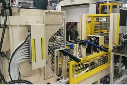 パイプの両端を押しつぶす設備となります。 この設備にて加工されるパイプは元々一枚の鉄板を丸めた後にその継ぎ目を溶接することで一本のパイプになります。 そのため、溶接された方向から押しつぶさない場合、溶接部分から破断してしまいますう恐れがあります。 この設備ではパイプを回転させながらカメラを使用して画像認識を行い、溶接ラインが常に真上を向くようにセットされることで 全自動の加工が可能となっております。