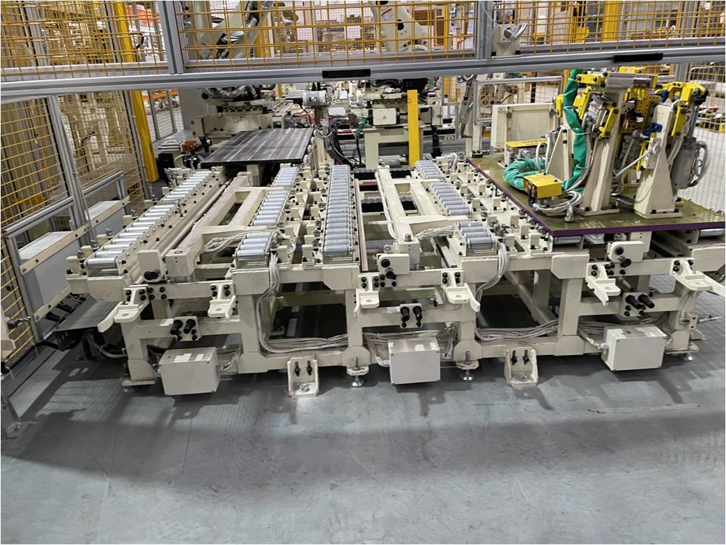 治具の欄にてご紹介させていただいたようなスポット溶接治具を生産車種変更時に自動でセット、収納を行う装置になります。 一般的に作業員の手作業によって段替えが行われるスポット溶接治具ですが、この装置によって段替え時間が大幅に短縮することが出来るだけでなく、 どうしても発生してしまう人為的なミスの可能性を大幅に減少させることができます。