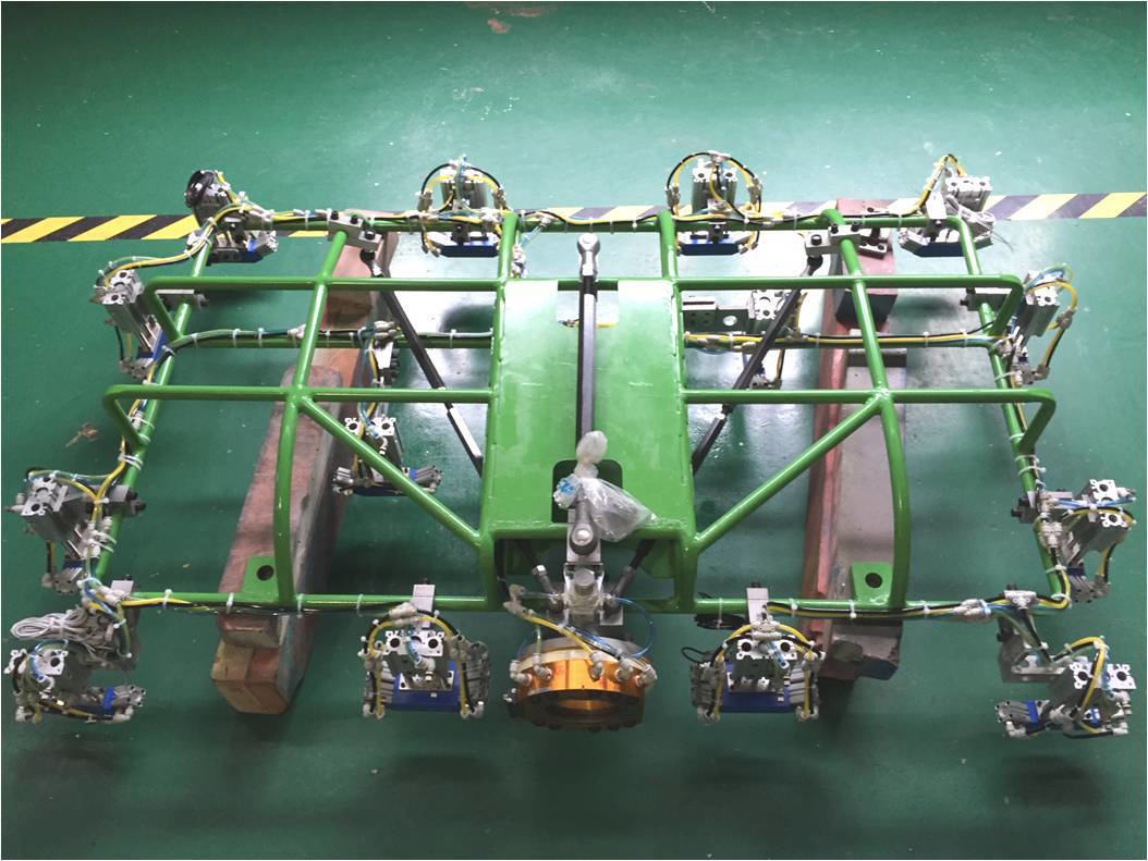 自動車のルーフ部分のスポット溶接治具です。2x2mほどのサイズとなりスポット溶接治具としては弊社で製造した中で最大級のサイズとなります。